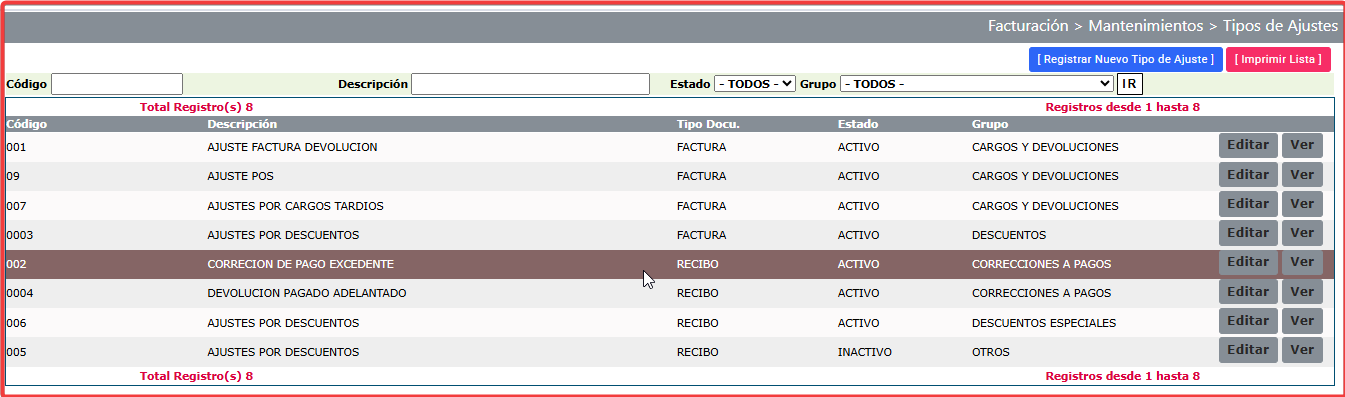 2- Crear la nota de ajuste con este tipo de ajuste (En caso de que no se haya creado), en "Facturación>mantenimiento>Tipo de ajustes" y colocar la cuenta de "Por pagar" que se quiera utilizar.