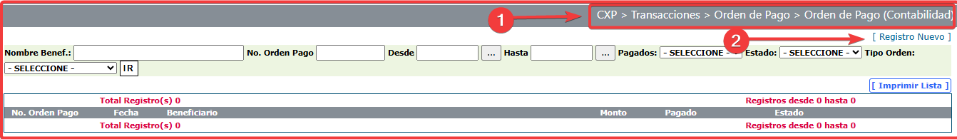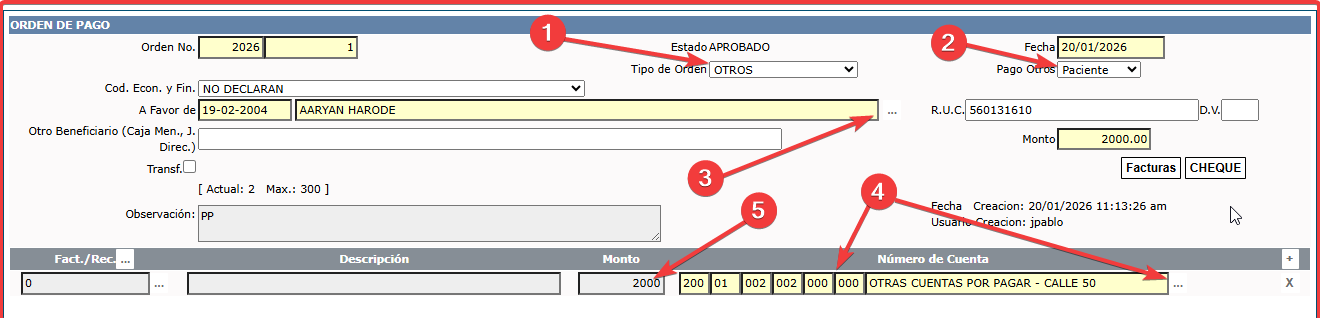 4- Ir a "CXpagar>Transacciones>Crear Orden de Pago- Contabilidad" y crear la orden de pago ( "Tipo Orden" = Otros, "Pago otros" = Paciente, Seleccionar el paciente, seleccionar la cuenta "Cxpagar otros", definida en el "tipo de ajuste" seleccionado en la nota de ajuste que se le hizo al recibo, poner el monto y guardar). Luego aprobar este tipo de orden y proceder a hacer el pago.