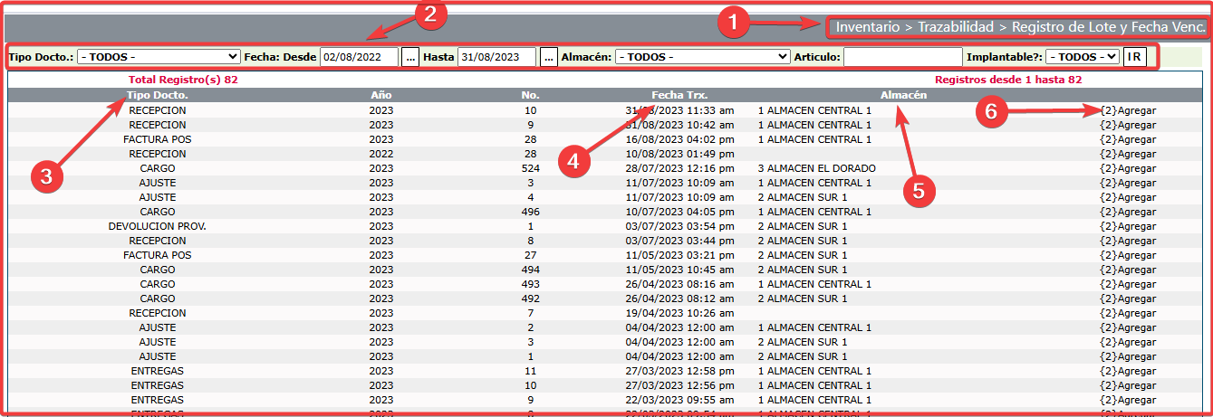 - Agregar: Botón que le permite editar el # de lote y fecha de vencimiento de los artículos que componen la transacción elegida.