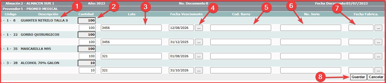- Recepción de productos en lotes con fecha de vencimiento: Al recibir los artículos en el inventario, ya sea por una orden de compra o sin ella, al guardar la recepción, se muestra una pantalla que permite capturar a cada artículo recibido un número de lote (1) una fecha de vencimiento (2) y un número serial (3) si lo tiene. Esto es en caso de que los insumos o productos se les deba controlar en que lote llegaron y la fecha de vencimiento. La siguiente pantalla muestra la recepción de estos valores en los artículos al guardar la recepción de los mismos en el proceso de recibir la mercancía de un proveedor. ruta: “Inventario>Transacciones>Recepción>Materiales y equipos con o (sin) órdenes de compras”.