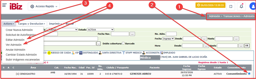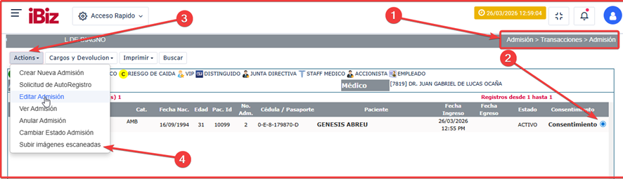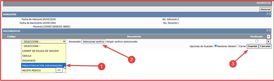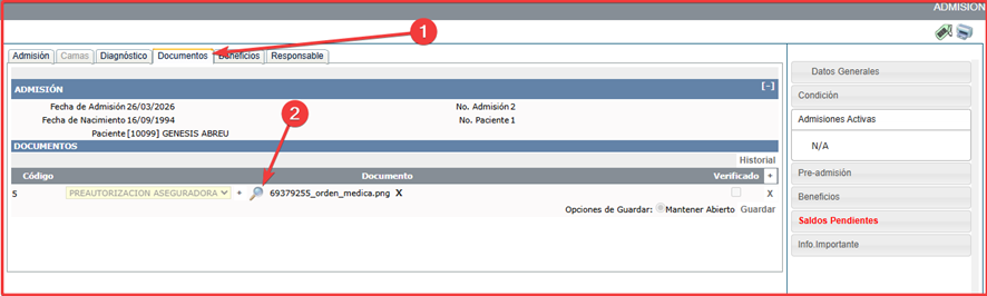 Para asociar documentos a una admisión se debe seguir los siguientes pasos de las siguientes imágenes: