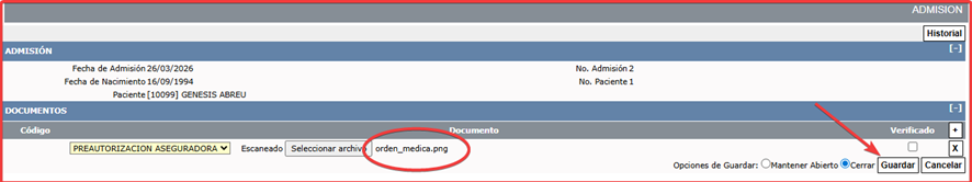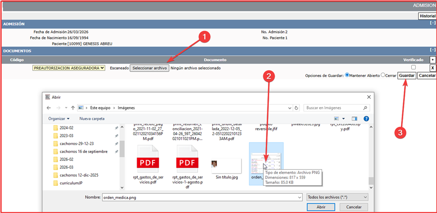 - Como primer paso La imagen del documento que se quiere asociar a una admisión, ya debe estar escaneada y en un directorio donde el operador del sistema pueda acceder a dicha imagen.